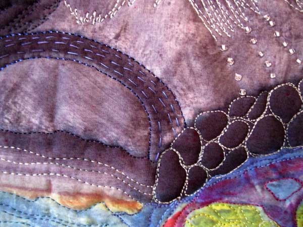 Here is a detail of the way I am binding the work, overcasting the raw edges with binding fibers and a zigzag stitch. The batting is felt, or two layers of flannel.